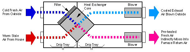 Fig 4. Typical HRV Construction An HRV as shown in Fig 4. captures the heat available from the exhaust air and transfers a good deal of it, (60% to 70%), to the incoming fresh air. Therefore only the balance of 30% to 40% of the heat is required to bring the fresh air up to 72° F. A further benefit of an HRV is the fresh air temperature entering the home is a good deal warmer than if it was not preheated. As the ventilation air is mixed into the return air of the furnace for delivery around the house, the air temperature leaving the furnace at the plenum is also warmer. Geothermal Furnaces recommend the use of a Heat Recovery Ventilator, Lifebreath HRV (HRV) for controlled mechanical ventilation. We employ heat recovery from stale exhaust to the homeowners advantage using primarily Lifebreath HRV equipment. The HRV minimizes unwanted air and moisture movement through the structural envelop and allows the intake and cleansing of the correct amount of fresh air for your home. Air tight construction does come with some controversy attached to it. High humidity levels have occurred in very tight, under ventilated buildings. Failures in air tight homes have all been due due to inadequate ventilation and are therefore preventable. As the saying goes "Build Tight and Ventilate Right". Geo-Thermal Furnaces Ltd. does not insist that customers build air tight. We know from experience however, that properly implemented, air tight homes stand out in energy performance and are the most comfortable and quiet. Talking with builders who have had good experiences with or even specialize in this type of home construction should prove worthwhile to the homeowner. And don't worry, Geothermal Furnaces will get the ventilation part right. |